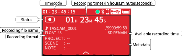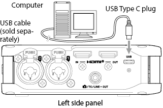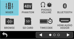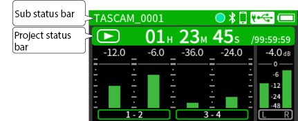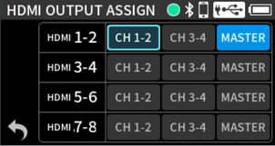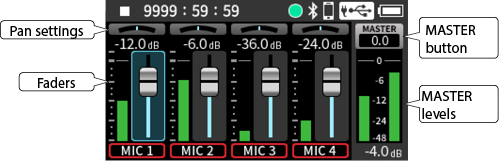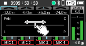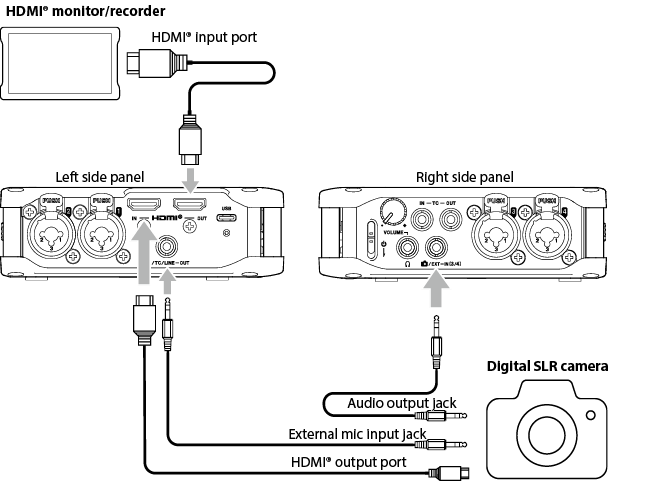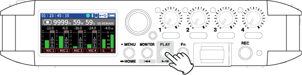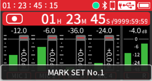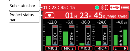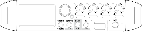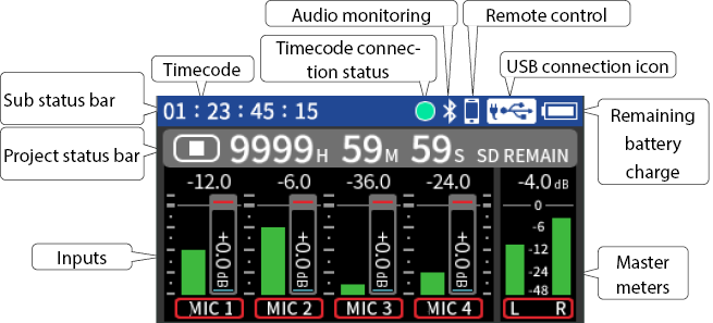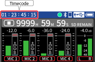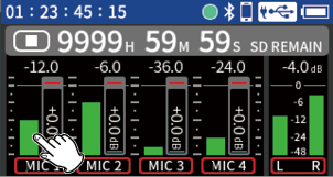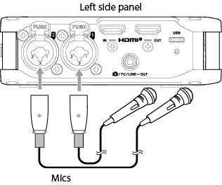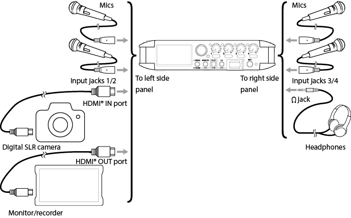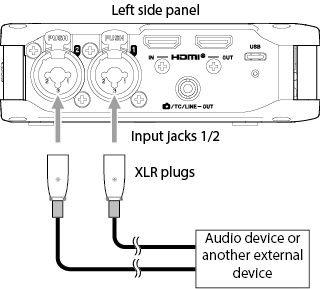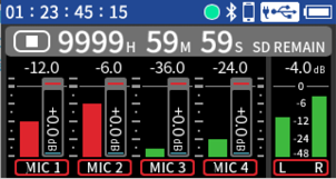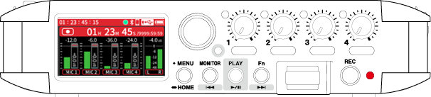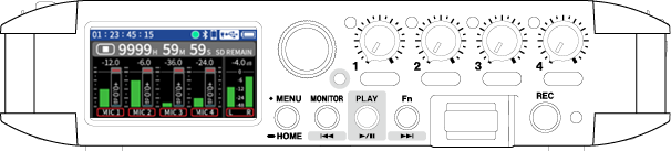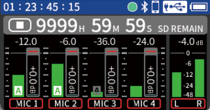 Input to input jacks 1–4 Phantom power used 48kHz 6ch WAV (BWF) 32-bit float recording Headphones connected HDMI® connected |