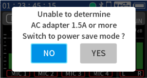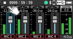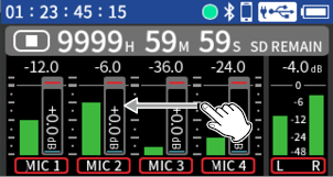 Input to input jacks 1–4 Phantom power used 48kHz 6ch WAV (BWF) 32-bit float recording Headphones connected HDMI® not connected |