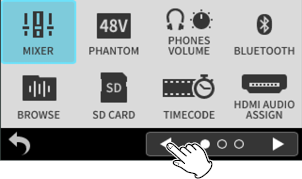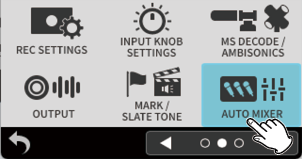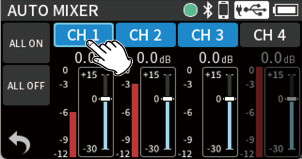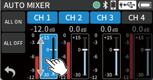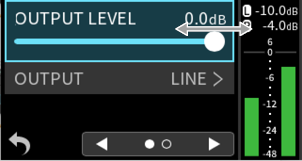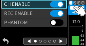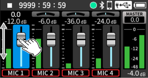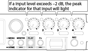 While watching the level meters, adjust the input level adjustment knobs so that levels average around −12 dB and the peak indicators do not light. (5-5. OTHER SETTINGS)