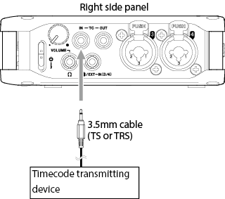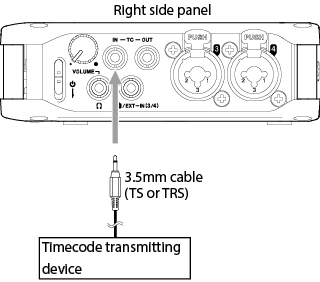 Use a 3.5mm cable (TS or TRS) to connect the output of the timecode transmitting device to the TC IN connector on this unit.