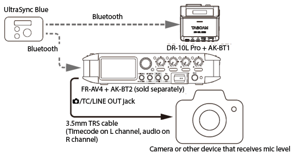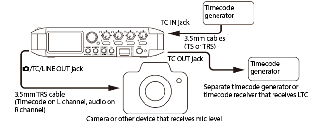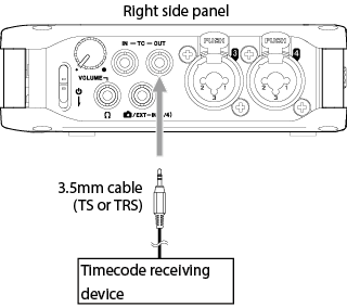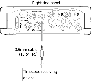 Use a 3.5mm cable (TS or TRS) to connect the input of the timecode receiving device to the TC OUT connector on this unit.