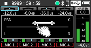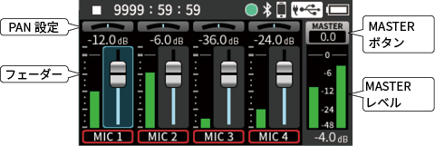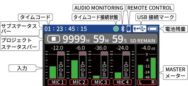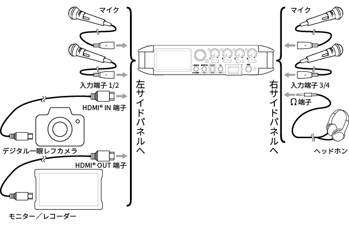 入力端子1/2/3/4入力 ファンタム電源使用時 (+48V、負荷:3mAx4) 6ch WAV(BWF)/48kHz 32-bit floatで録音 ヘッドホン接続 HDMI®接続 |