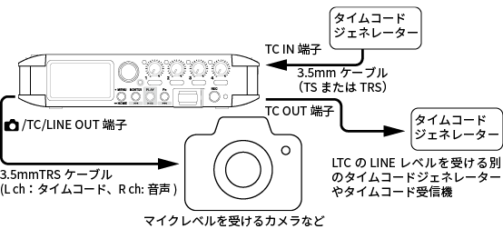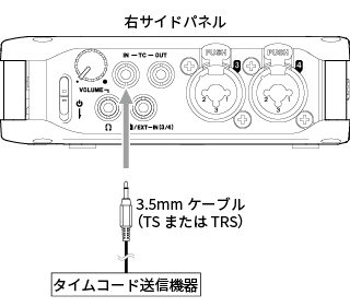 3.5mmケーブル(TSまたはTRS)を使って、タイムコード受信機の入力を本機のTC OUT端子に接続します。