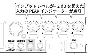 レベルメーターを見ながら−12 dBを中心にレベルが変化し、PEAKインジケーターが点灯しないようにインプットレベル調節つまみを調節してください。(5-5. その他の設定)