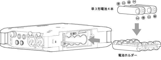 単3形電池4本(アルカリ乾電池、ニッケル水素電池またはリチウム乾電池)