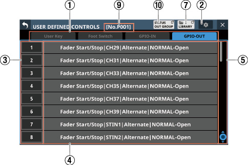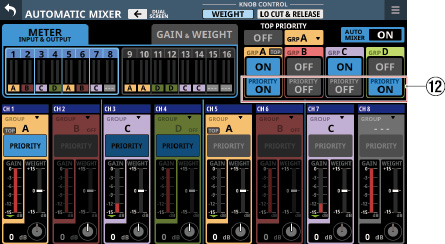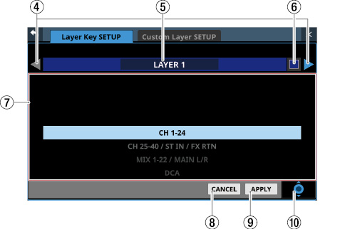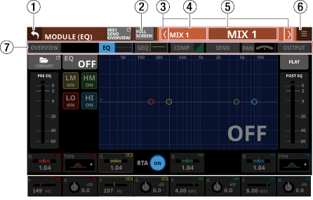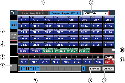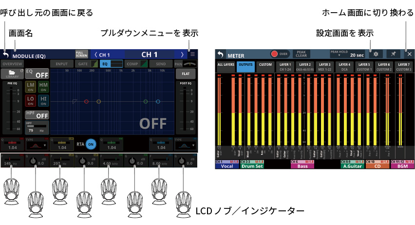 タッチスクリーンの下に並ぶ8つのつまみをLCDノブと呼び、左から順にLCDノブ1〜LCDノブ8と表記します。