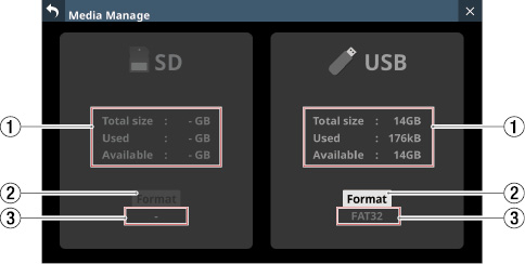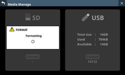 本機でSDカード/USBメモリーを使用する際は、必ず本機にてフォーマットを行ってください。(→「Media Manage画面」)