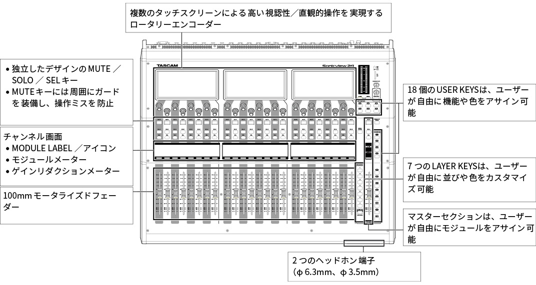 本機は、2つ(Sonicview 16/16dp)または3つ(Sonicview 24/24dp)のカラータッチスクリーンを装備、16ch(Sonicview 16/16dp)または24ch(Sonicview 24/24dp)のマイクプリアンプ、44インプットチャンネル/24バス、DanteインターフェースとUSBオーディオインターフェースを搭載したデジタルミキサーです。